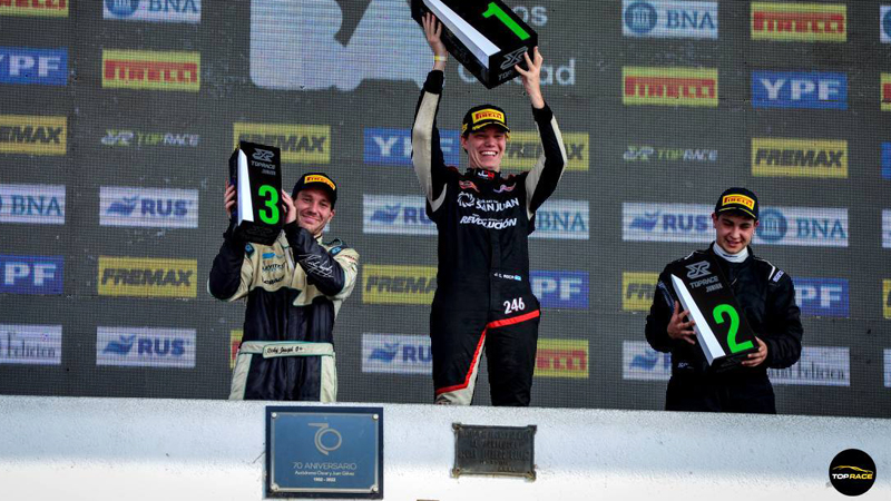 Agustín Joseph (3), Juan Cruz Roca (1) y Nicolás Villamayor (2) el podio de la 1ra. fecha del Top Race Junior en Buenos Aires. | Fotos Imagen de TV